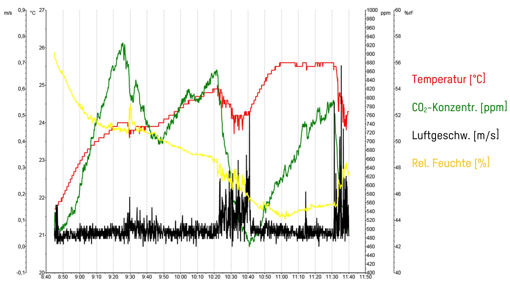 - In der Pause (Tür und manuelle Fenster teilweise geöffnet, automatisierte Fenster max. geöffnet) sank der CO2–Wert deutlich.