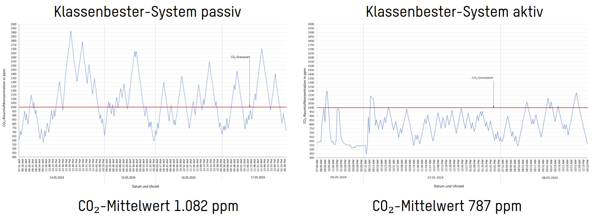 Bei inaktivem System wurden Spitzenwerte von bis zu 2.070 ppm gemessen – weit über dem Grenzwert der ÖNORM H6039 (2023). Mit aktivem System hingegen wurden CO₂-Spitzen rasch abgebaut.